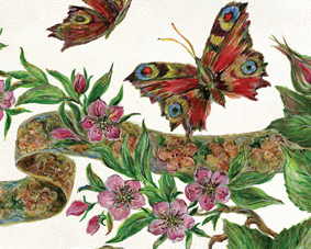 - d. Meticulous, delicate sewing of velvet onto the artwork beneath the parchment, which protects the parchment from cuts, enhances its appearance and gives it a finished look.